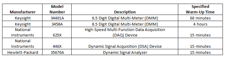 of the power supply for the equipment, the charging time constant of filter or bias circuits (more prevalent in transducers), etc. Table 1 shows the specified warm-up time for several common pieces of measurement equipment.