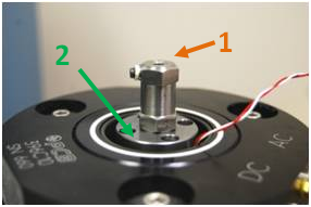 The data displayed here was acquired using The Modal Shop’s ISO 17025 accredited laser primary accelerometer calibration system. The B&K 8305 reference accelerometer was mounted on an air bearing shaker in both upside-up and upside-down configurations as described in the table above. The plot shows the corresponding calibration frequency response data acquired against the laser reference for these four test configurations. Figure 3 shows the two mounting configurations each with two possible laser reference measurement locations. Correct calibration results are obtained by mounting the double-ended reference accelerometer upside-up, with the laser reference measurement made on the upper exposed SUT mounting surface, indicated by the Orange #1. Since the reference accelerometer is calibrated this way, it should always be used exactly this way. All other calibration configurations generate significant bias errors, especially at higher frequencies, as shown by Figure 2 and detailed in Table 1.